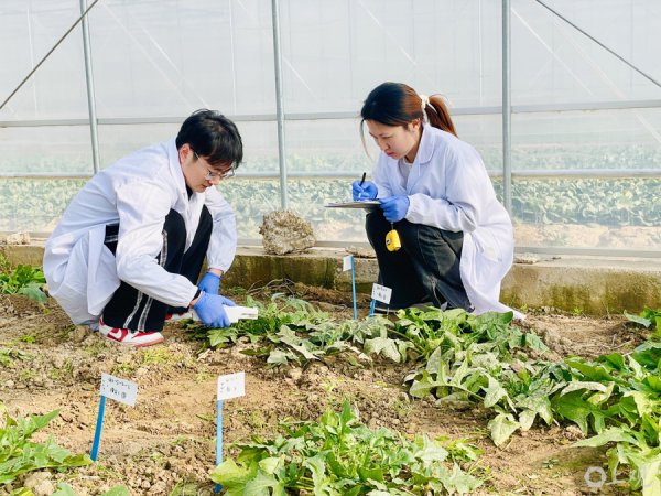 培育基地里,两名上师大规划生正在用仪器测量菠菜的性状。(李相如摄) 12月16日下昼,由上海师范大学人命科学学院蔬菜遗传育种团队牵头的2025年上海市农业科技立...